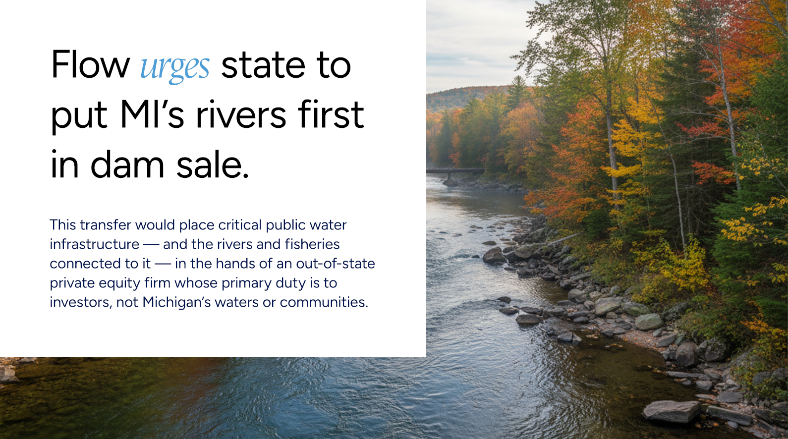 Flow Water Advocates formally urged the Michigan Public Service Commission to reject the proposed sale of 13 Michigan hydroelectric dams from Consumers Energy to a private equity–backed affiliate of Hull Street Energy. This transfer would place critical public water infrastructure — and the rivers and fisheries connected to it — in the hands of an out-of-state private equity firm whose primary duty is to investors, not Michigan’s waters or communities. In our filing, we raised serious concerns about water quality compliance, long-term accountability, and the state’s obligations under the public trust doctrine.